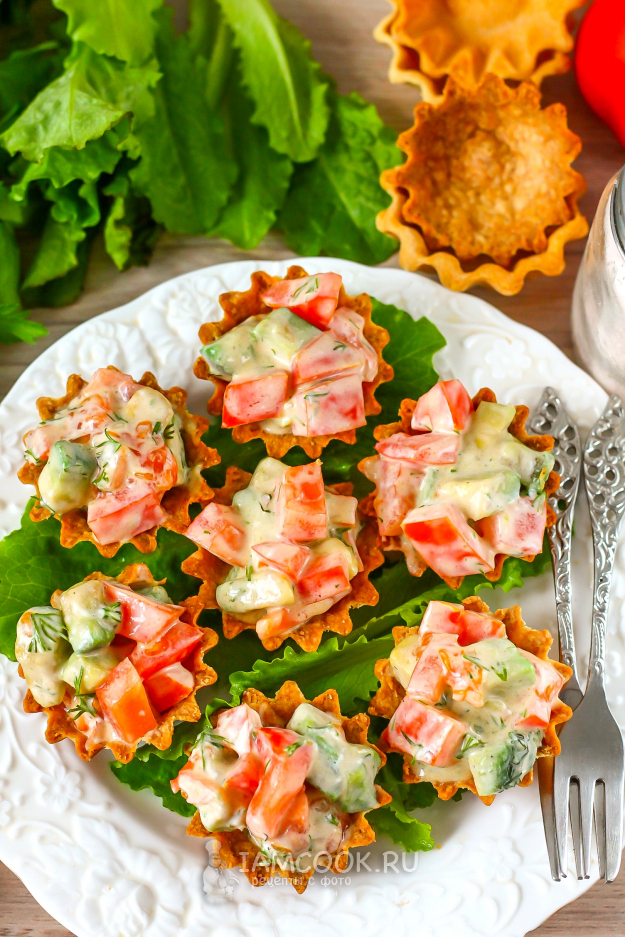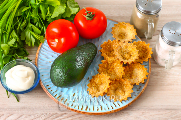 Подготовьте необходимые ингредиенты для создания аппетитных тарталеток с авокадо и помидорами.