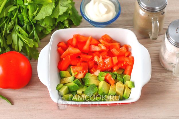 Помидоры промойте в воде, вырежьте из плодов зеленые сердцевинки и нарежьте такими же кубиками, как и авокадо. Если не очень любите сок от помидоров, можете слить его, добавляя нарезку в емкость.