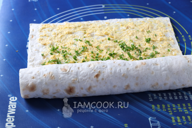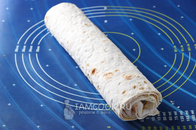 Плотно свернуть лаваш в рулет. Чтобы край лучше зафиксировался, его можно смазать майонезом.
