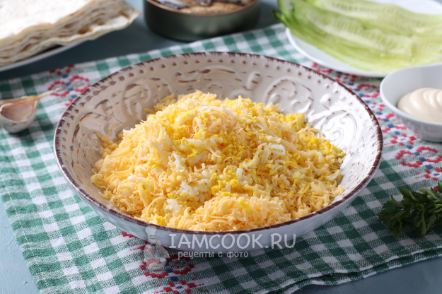 На тёрке натереть твёрдый сыр. Яйца почистить и также натереть на тёрке. Огурец нарезать тонкими полосками с помощью овощечистки.