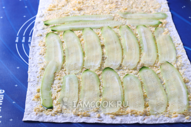 На столе разложить один лист лаваша, смазать его половиной смеси. С одного края разложить ленты огурцов.
