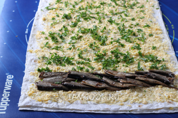 Выложить второй лаваш сверху первого, смазать оставшейся смесью. На край выложить полосой шпроты в 2 ряда. Оставшуюся свободную часть посыпать измельчённой петрушкой.