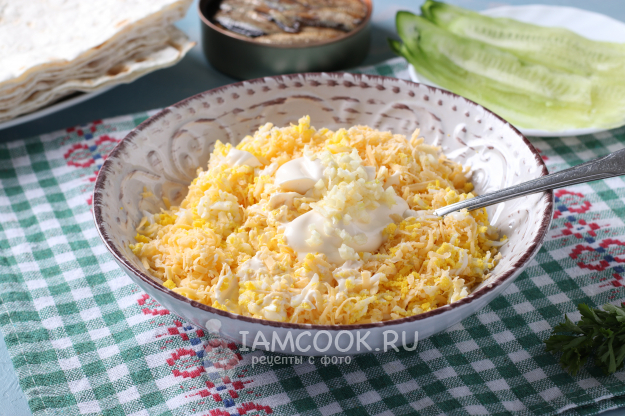 В полученную смесь добавить майонез, соль, перец и измельчённый чеснок. Всё тщательно перемешать.