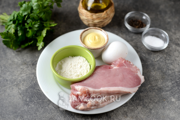 Подготовьте необходимые продукты для жарки отбивных из свинины в майонезе на сковороде (в кляре). Свинину помойте и обсушите насухо, нарежьте тонкими ломтиками.