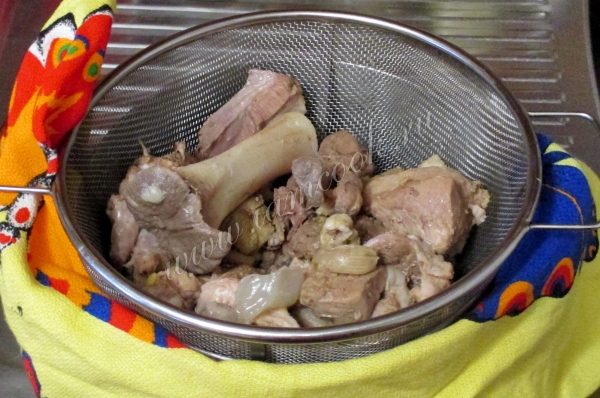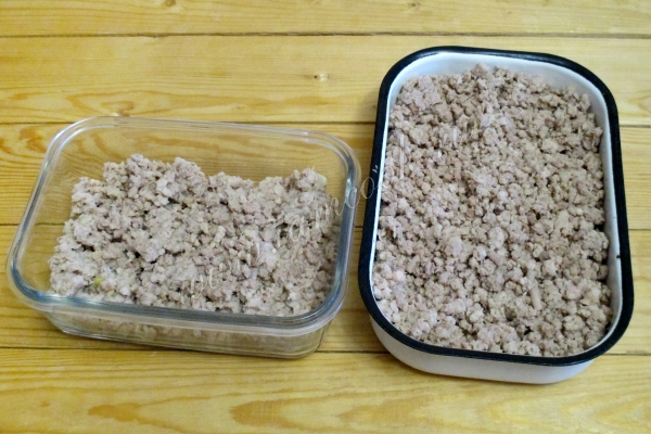 Разложите мясо по лоткам и залейте бульоном, в котором оно варилось.