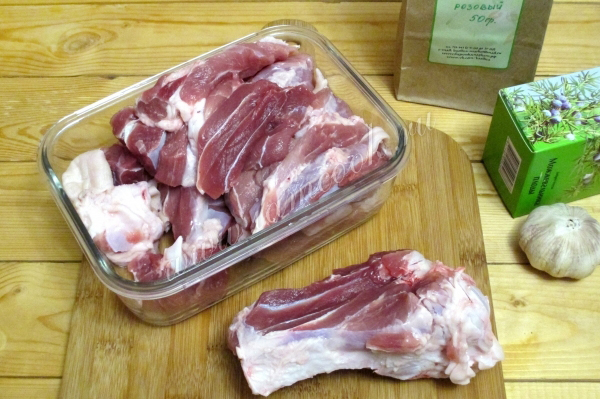Нарежьте мясо ножом или пропустите всё (кроме костей) в мясорубку через насадку с крупными ячейками.