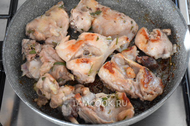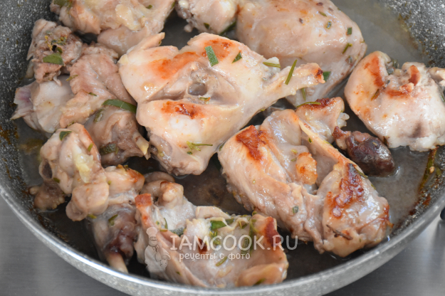 Вынуть куски кролика из маринада. Маринад не выливать! Выложить мясо в сковороду, увеличить огонь и обжарить до золотистого цвета.