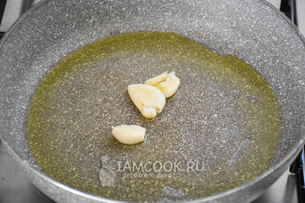 В глубокой сковороде разогреть оливковое масло и обжарить зубчики чеснока, предварительно раздавленные плоской стороной ножа.