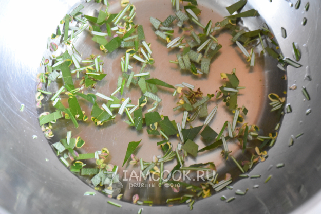 В глубокую миску налить вино. Добавить измельченные листья лаврового листа, шалфея, листики тимьяна, розмарина и хорошо перемешать.