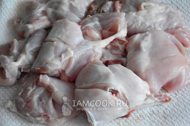 Тушку кролика помыть, обсушить бумажным полотенцем и нарезать на порционные куски.