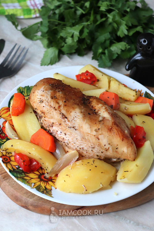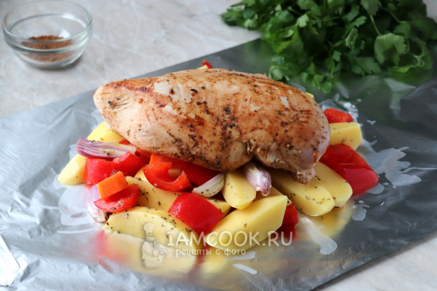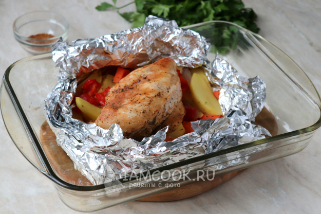 Фольгу плотно завернём, лучше её сложить в несколько слоев, и выложим на противень или в жаропрочную форму. Отправим куриную грудку с овощами в фольге в духовку, разогретую до 180 градусов, на 35 минут.
