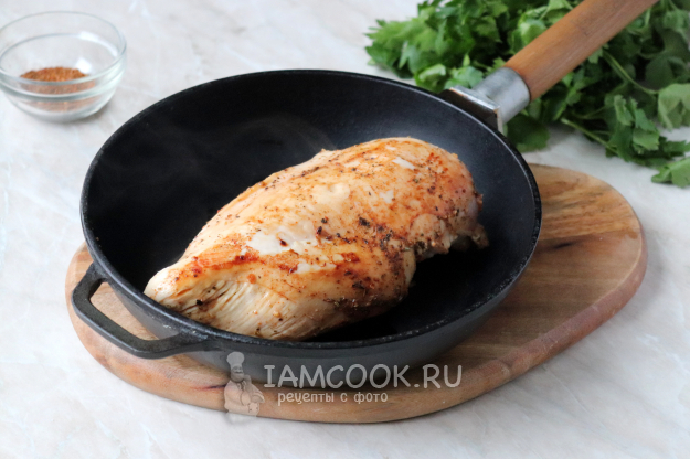 Куриное филе обжарим на сухой, хорошо раскалённой сковороде с обеих сторон до румяной корочки. Тем самым запечатаем все мясные соки внутри.