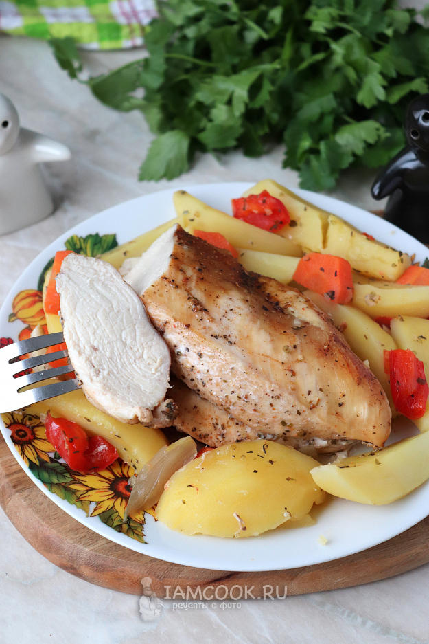 Сверху мясо румяное, а внутри сочное. В сочетании с овощами - очень вкусно.