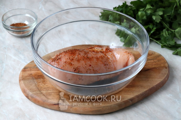 Куриное филе промоем под холодной проточной водой, обсушим и натрём специями. Я использовала соль и приправу для мяса, вы же можете взять любые другие специи, опираясь на свой вкус. Выложим мясо в глубокую миску и зальём соевым соусом. Оставим на 15-20 минут при комнатной температуре (можно и на дольше, только уже в прохладном месте).