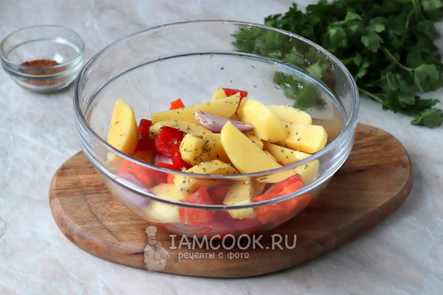 Пока курочка маринуется, займёмся овощами. Почистим их, промоем и нарежем произвольными кусочками. Если картофель крупный - разрежем на 4 части, мелкий - пополам. Лук (у меня лук-шалот) также нарежем вдоль на несколько частей. Болгарский перец - крупными кубиками, морковь - по желанию. Главное, чтобы овощи были примерно одинакового размера. Посолим их и посыплем прованскими травами. Перемешаем.