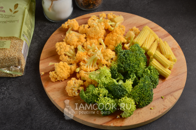 Цветную капусту и брокколи разделите на небольшие соцветия, кукурузные початки разрежьте на несколько частей. Промойте все овощи проточной водой.
