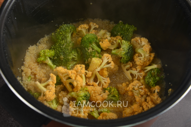 Так как столько времени для варки овощей будет слишком много, их стоит добавить через 10 минут варки киноа. Также нужно будет слегка подсолить. Перемешивать нет необходимости - в чаше будет достаточно высокая температура, чтобы овощи дошли до готовности.