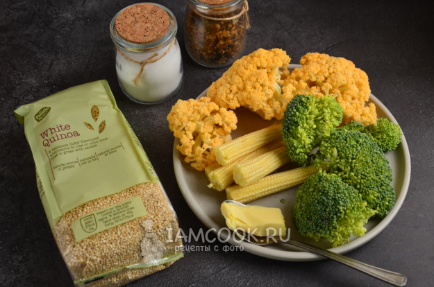 Возьмите все необходимые продукты для приготовления киноа с овощами в мультиварке.