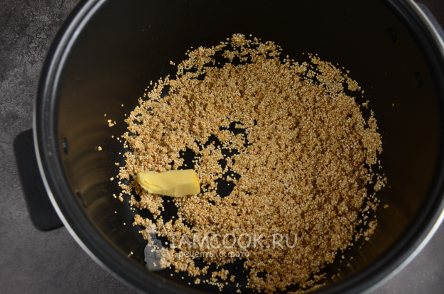 Киноа тщательно промойте и переложите в чашу мультиварки. Добавьте кусочек сливочного масла и щепотку соли.