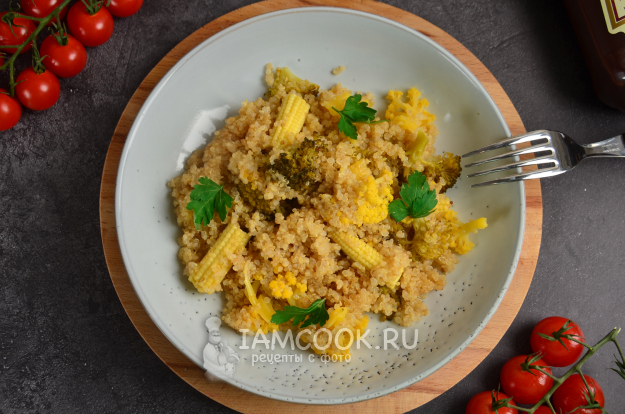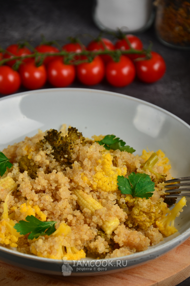 Подавать киноа с овощами можно сразу, после сигнала таймера мультиварки. В порцию добавьте свежую зелень.