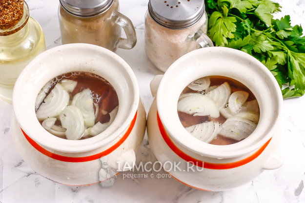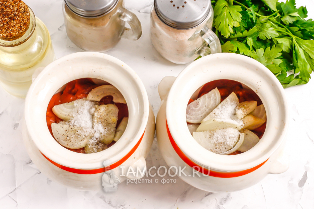 Очистите репчатый лук от кожуры, промойте в воде и нарежьте полукольцами. Выложите овощную нарезку в горшочки. Посолите и поперчите. По желанию добавьте и другие специи или приправы, например - к курице. Лавровые листья не добавляйте, так как гречка и так имеет горьковатый привкус.