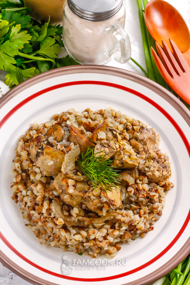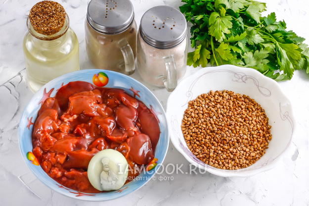 Возьмите необходимые ингредиенты для приготовления гречки с куриной печенью в горшочке в духовке.