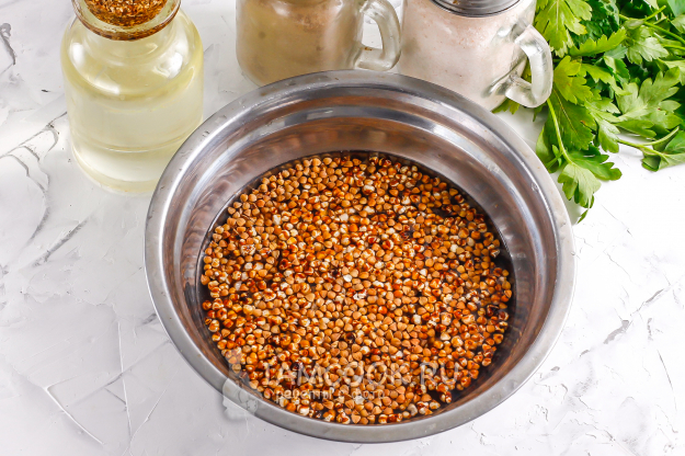 Гречневую крупу промойте в воде, удалите пережаренные черные зерна.