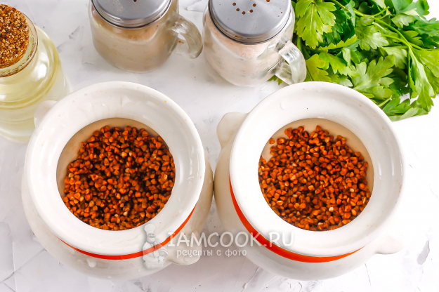 В каждый горшочек влейте 0,5 ч.л. растительного масла, выложите гречку, разделив ее на одинаковые половины.