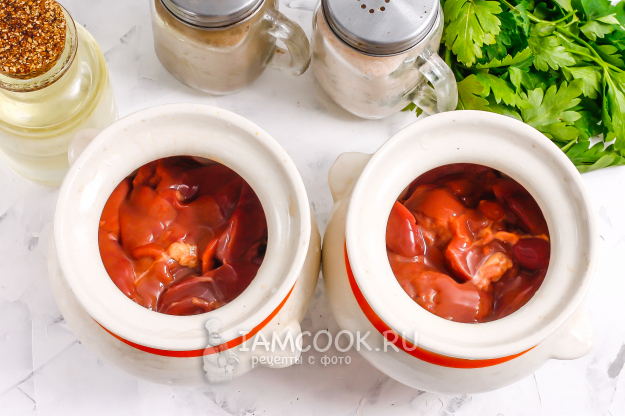 Промойте куриную печень, удалите желчные протоки, разделите массу пополам и также выложите в горшочки.