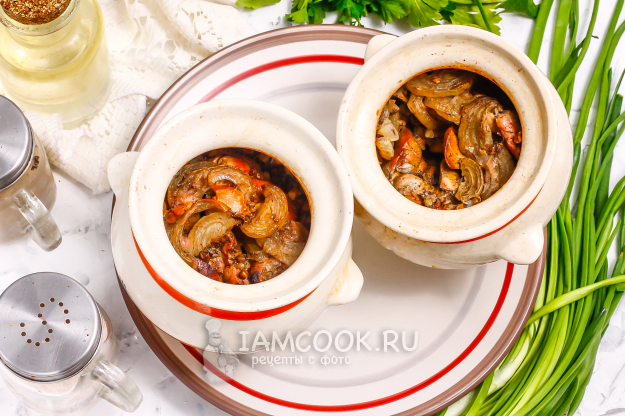 Влейте горячую воду и поместите горшочки с гречкой и куриной печенью в духовку при 200 градусах на 35-40 минут, накрыв крышечками.