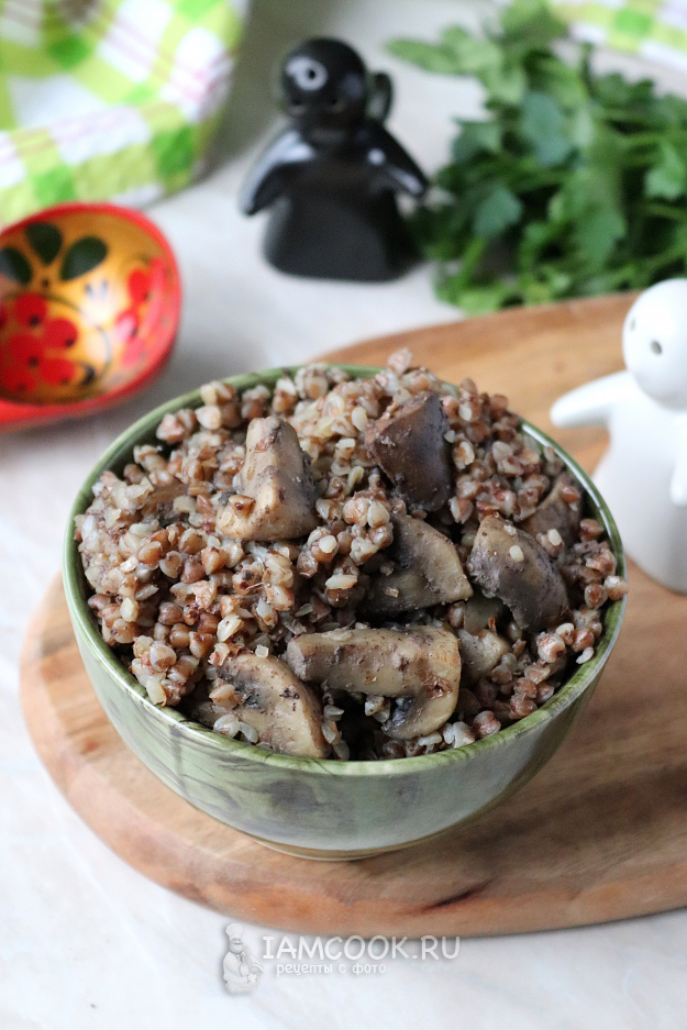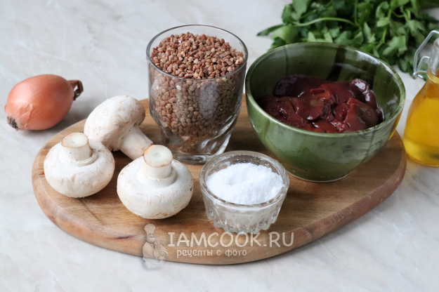 Для приготовления гречки с куриной печенью и грибами подготовить из списка необходимые ингредиенты. Заранее почистить лук и грибы. Гречневую крупу перебрать и промыть, меняя воду 2-3 раза.