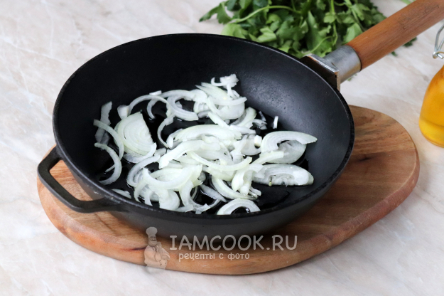 Лук нарезать полукольцами и обжарить до прозрачности на растительном масле, периодически помешивая.