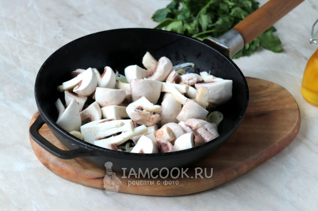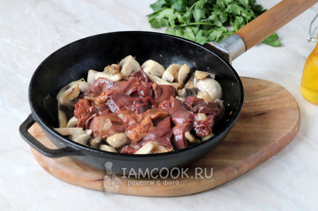 Шампиньоны разрезать на 4 части (мелкие можно и вовсе не разрезать) и добавить к обжаренному луку. Грибы сразу же пустят много сока, а когда жидкость испарится - начнут жариться и приобретать золотистый цвет. Тогда и нужно будет добавить к ним печень.