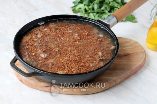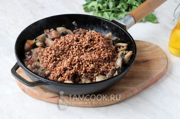Затем всыпать подготовленную гречневую крупу.