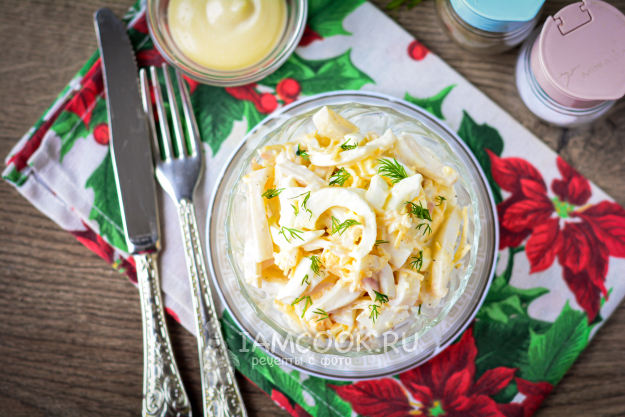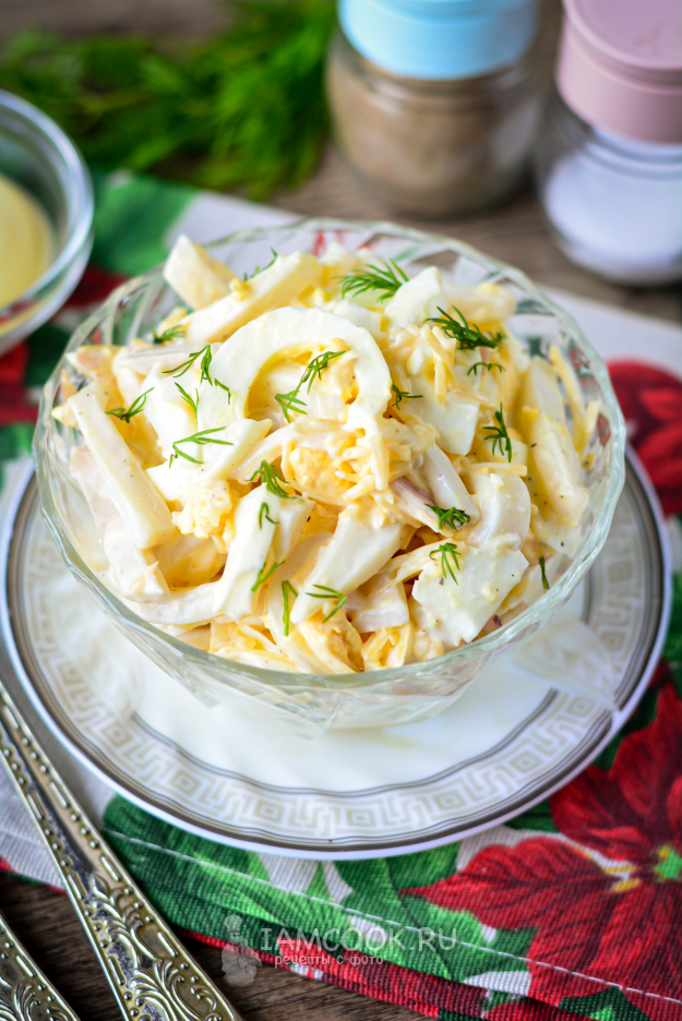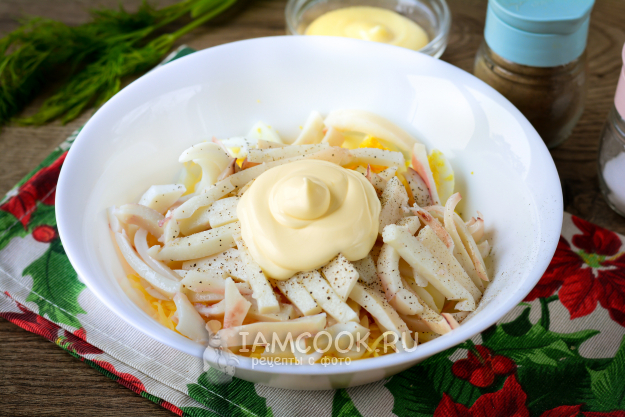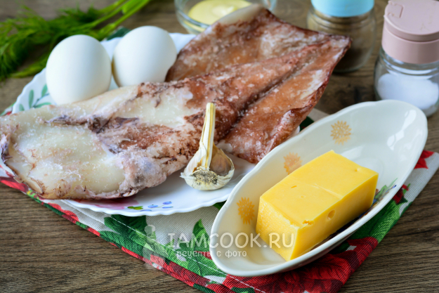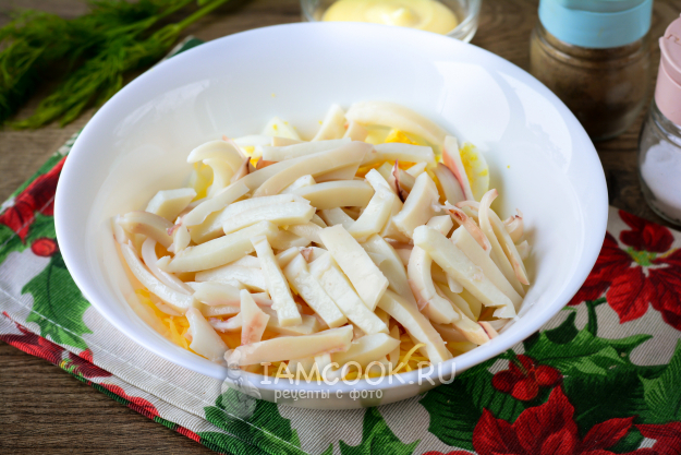 Сварите кальмаров и яйца, останется лишь натереть сыр и добавить чеснок для остроты. Чтобы салат с кальмарами, сыром и чесноком стал более сочным, добавьте вкусный майонез - соус может быть магазинным или домашним, на ваше усмотрение.