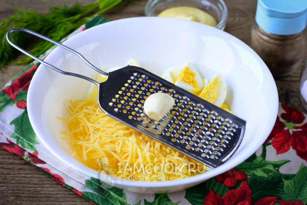 Натрите на мелкой терке чеснок или выдавите его через чеснокодавку. Количество чеснока берите по вкусу.