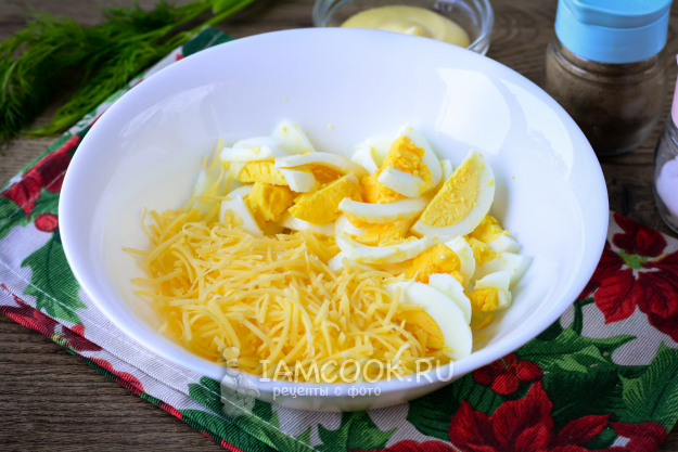 В глубокую емкость выложите подготовленные яйца и сыр.
