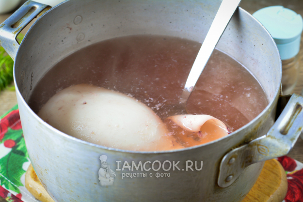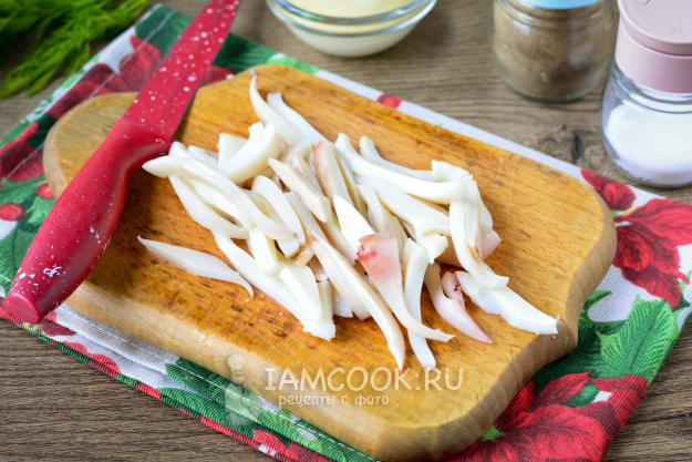 Вскипятите 1-1,5 литра воды, чуть посолите, опустите тушку кальмара, варите 1 минуту - так кальмар останется мягким и вкусным. Достаньте морепродукт из кипятка и дайте остыть.