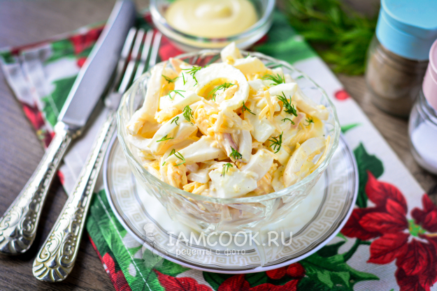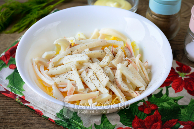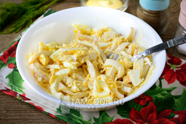 Перемешайте. Соуса не жалейте - салат должен стать сочным, так как в нем много сыра и яиц, а они суховаты и их нужно хорошо сдабривать майонезом.