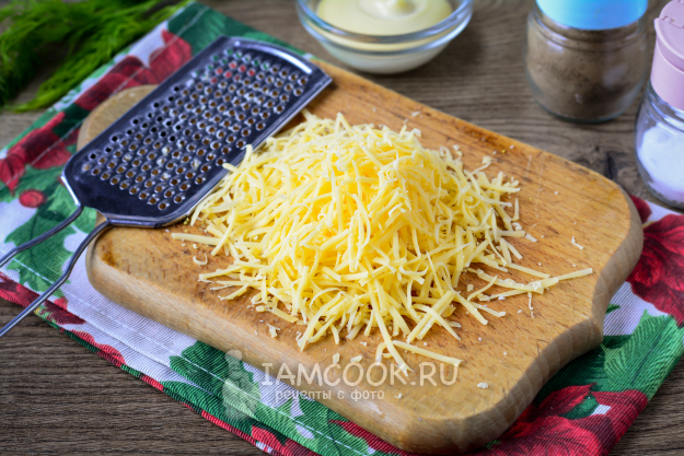 Твердый сыр натрите на средней терке. Советую использовать ароматный сыр с пикантной ноткой, например, Радомер или Маасдам. Такие сыры сочетаются с морепродуктами.