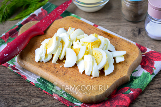 Сварите вкрутую куриные яйца, остудите и почистите, затем нарежьте полосками.