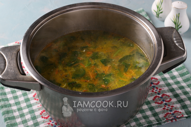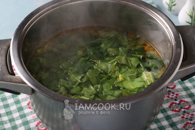 Если картофель уже протыкается вилкой, то можно добавлять в суп зажарку и шпинат.
