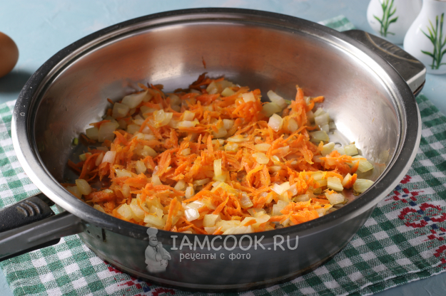 В сковороде разогреть постное масло, обжарить лук с морковью до мягкости.