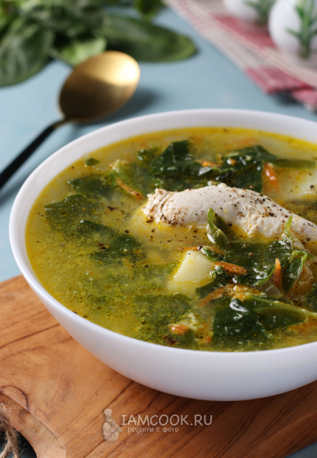 Разлить куриный суп со шпинатом и яйцом в тарелки, в каждую добавить по кусочку филе и подать к столу.