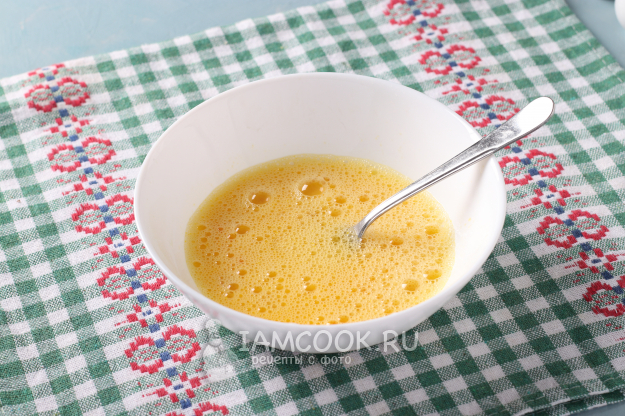 Яйцо разбить в мисочку, взболтать вилкой и добавить несколько ложек бульона из кастрюли, перемешать.