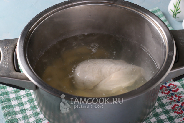 Для приготовления куриного супа со шпинатом и яйцом подготовить из списка необходимые ингредиенты. Куриное филе промыть, опустить в кипящую воду и варить 20 минут.