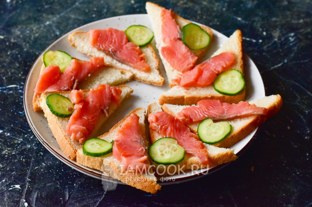Затем нарежьте кружочками свежий огурец и разложите их на каждый бутерброд.