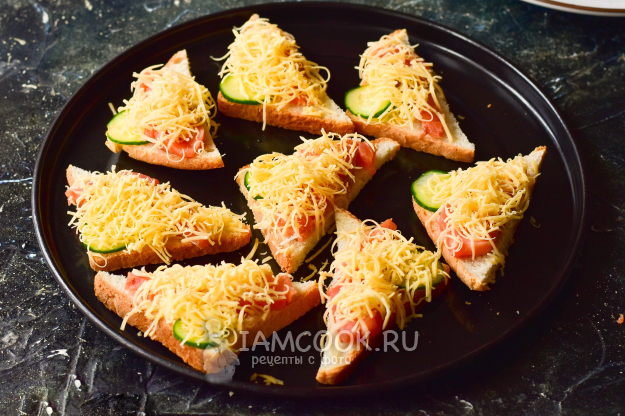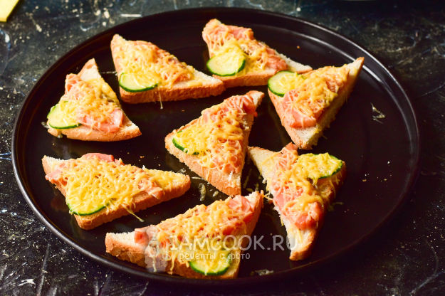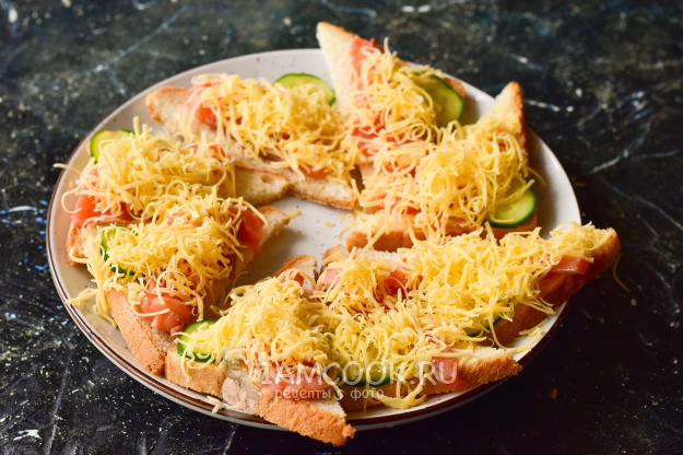 Переложите бутерброды на противень и отправьте их на минуту в разогретую до 190 градусов духовку.