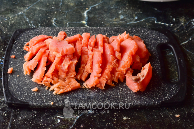 Нарежьте копченую горбушу на кусочки.