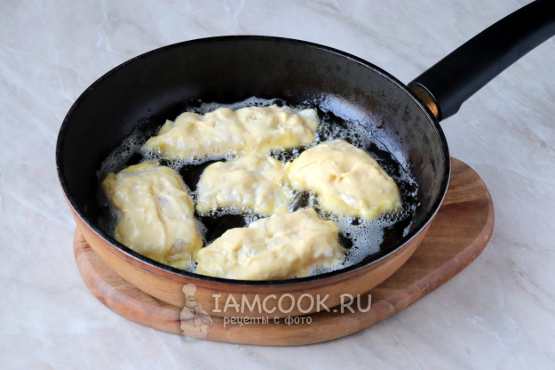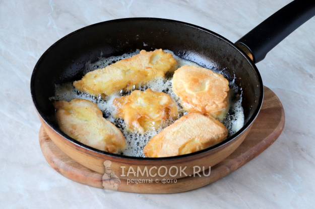 Окуните и проверните филе пангасиуса в кляре. Затем переложите его на раскалённую с растительным маслом сковороду.